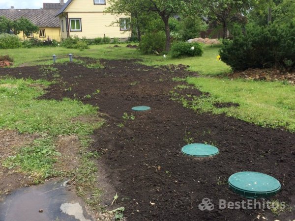 Установка септика: Первым этапом было сделано рытьё котлована под септик и рытьё траншеи под трубы к дому. Далее следовала засыпка щебнем, установка септика и укладка труб канализации на песчаную подушку.