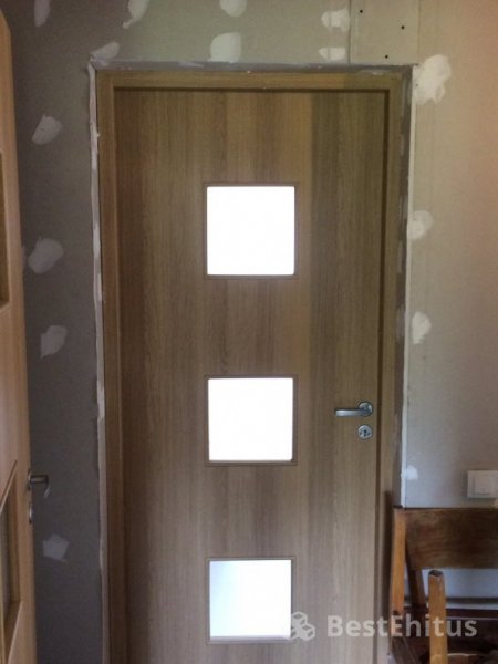 Внутренняя отделка: установка межкомнатных дверей, установка перегородок из гипсокартона на металический каркас вместе со звукоизоляцией. Замена полового покрытия на новые строганные доски, с укладкой на основу бруса, с последующей грунтовкой и покраской досок.