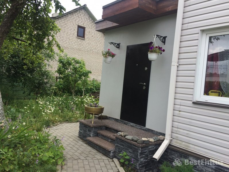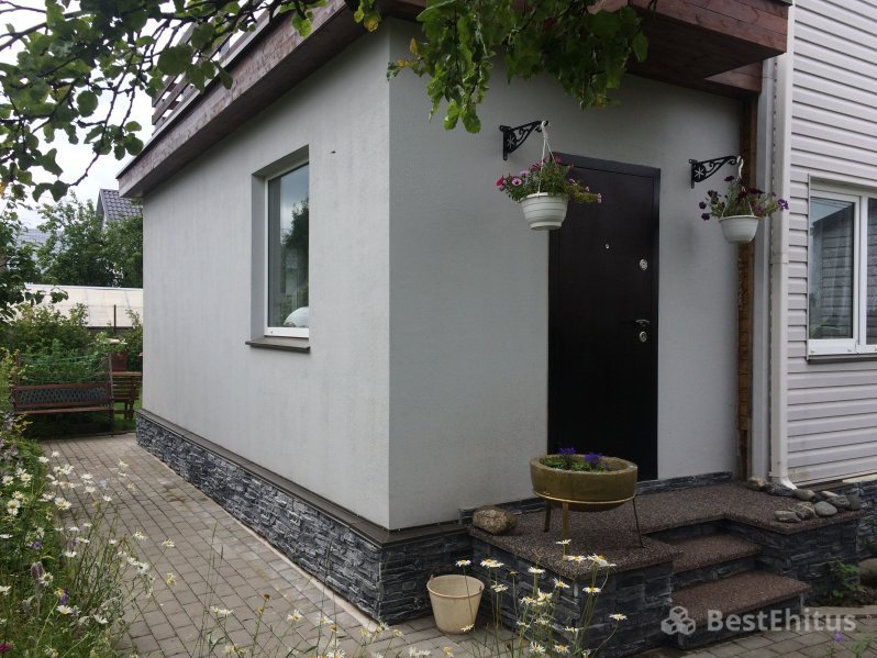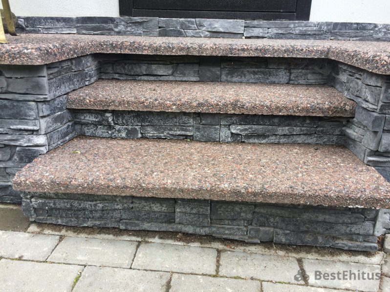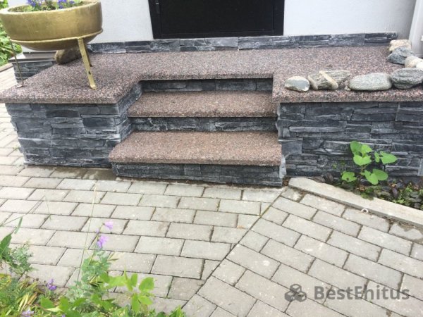 В данном объекте нами была уложена тротуарная плитка и изготовлено крыльцо к дому. На поверхность крыльца уложен прочный и красивый гранитный камень. Боковая отделка крыльца и цоколя дома - декоративный камень. Само помещение отделано термо краской снаружи, в результате чего, по словам владельца, в помещении стало намного теплее. Подробнее о термо краске можете прочитать в нашей статье ЗДЕСЬ