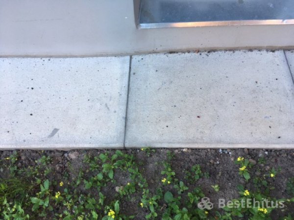 Значительный плюс данной работы по отмостки в том, что в ходе природных явлений, на случай изменения идеальной плоскости покрытия, в любое время возможно отреставрировать отмостку - поднятием плиты с подсыпкой и травбовкой основания. Что, к сожалению, нельзя сделать в случае с залитой бетонной отмосткой.