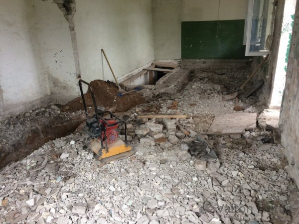 В работы было выровнено основание пола щебнем, поверх щебня уложен утеплитель с армированием всей площади. На конечном этапе происходила заливка основания пола бетонном с последующей его шлифовкой. Так называемая заливка полов бетоном "под вертолёт".