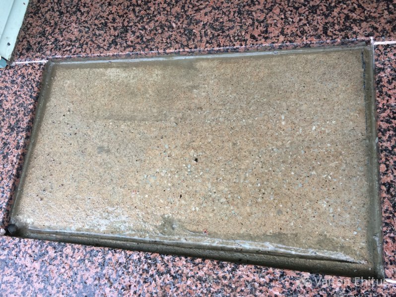 В ходе работы под гранитным камнем была уложена водоотводная труба для отвода дождевой воды из под решётки для вытирания ног.