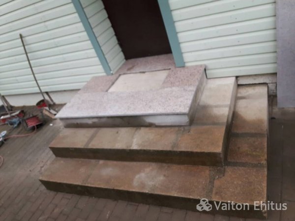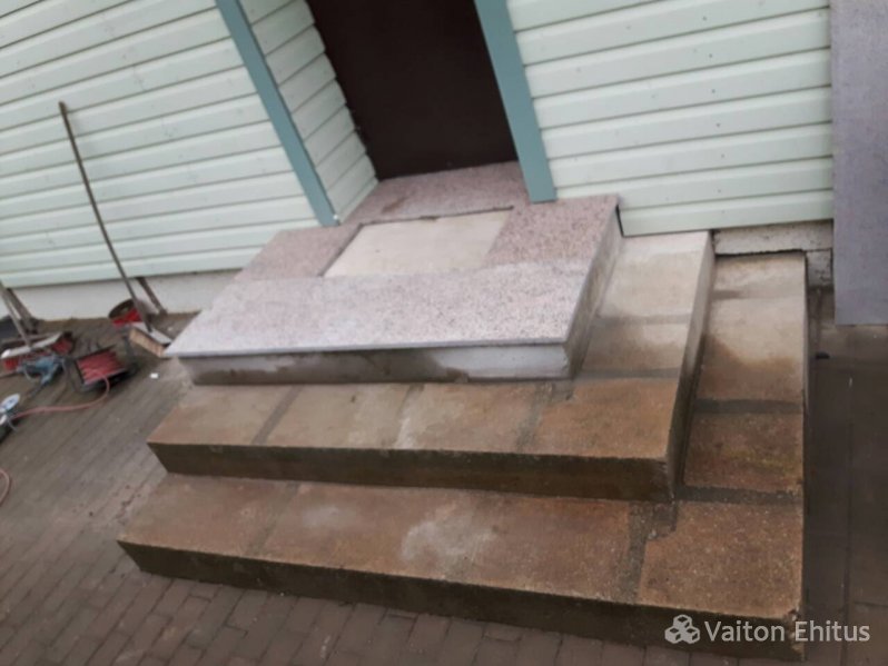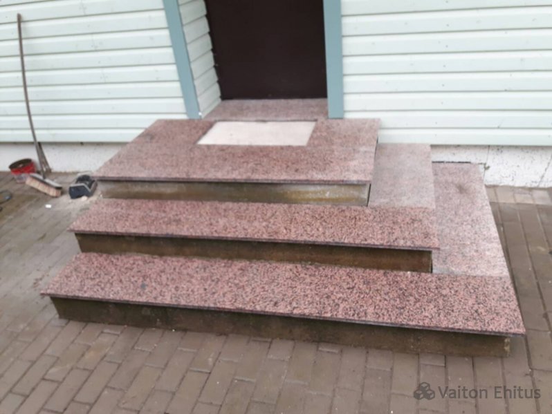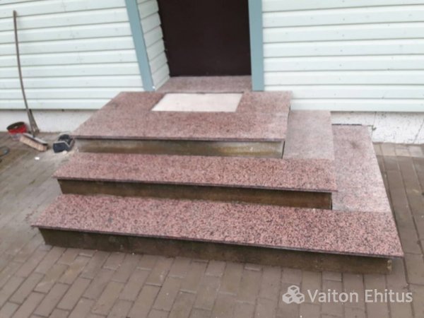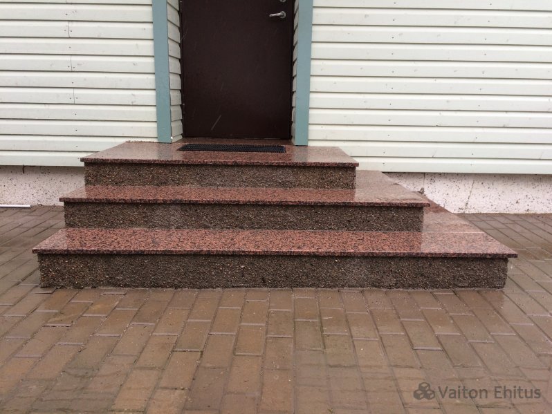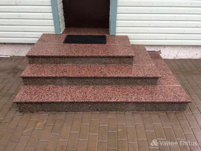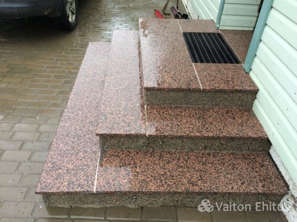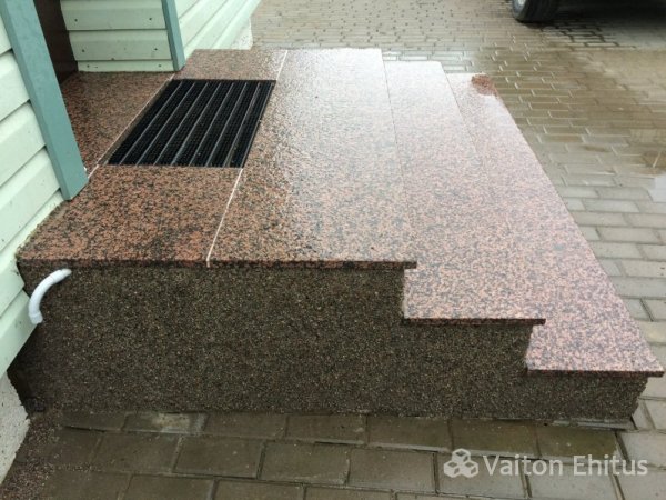 Установка обожжённого гранитного камня на бетонное крыльцо с торцевой укладкой гранитной крошки.