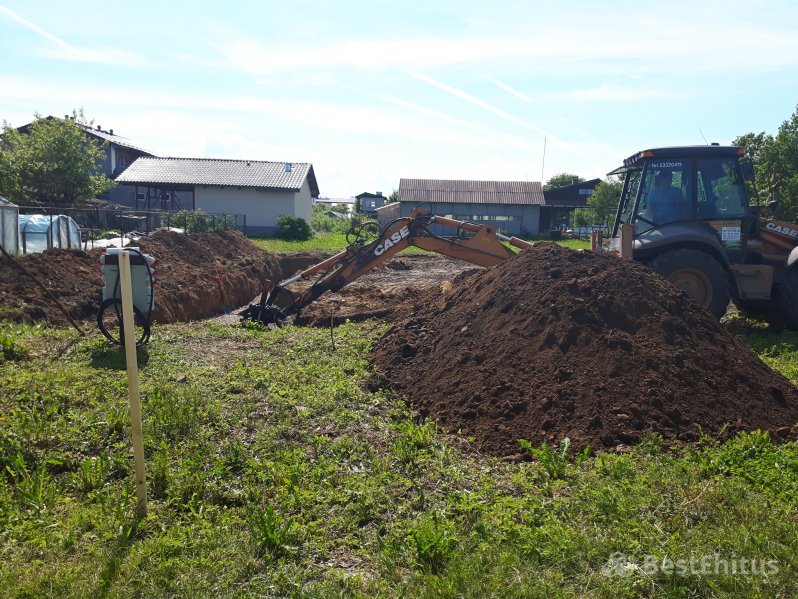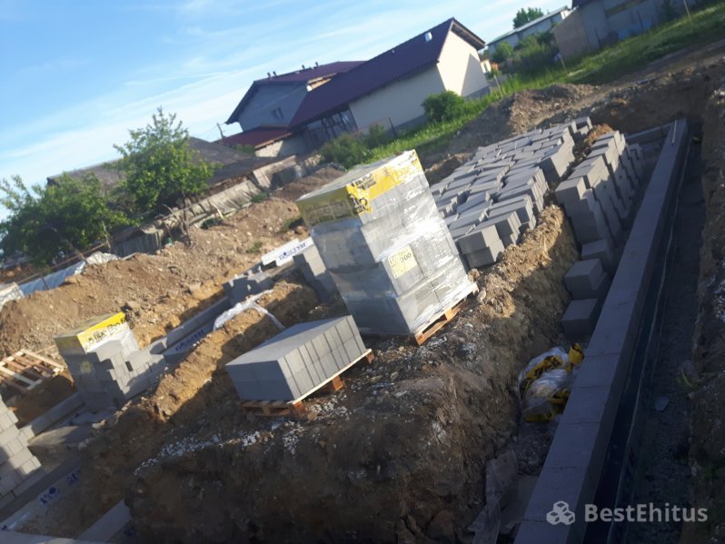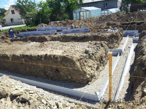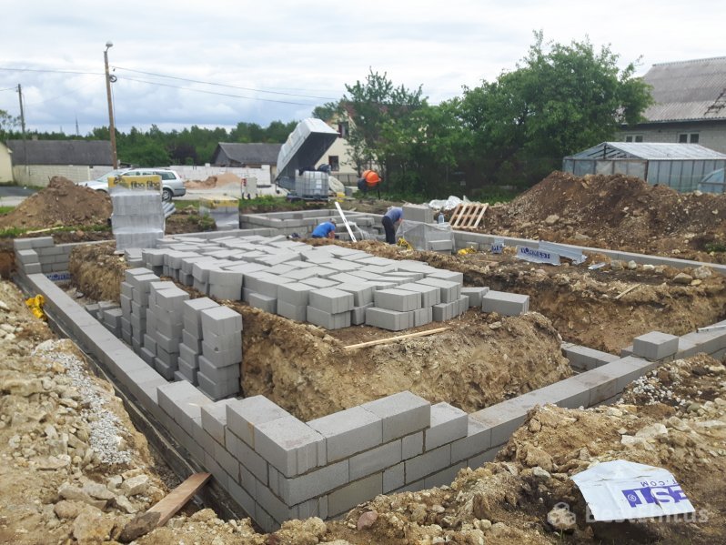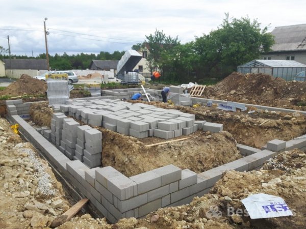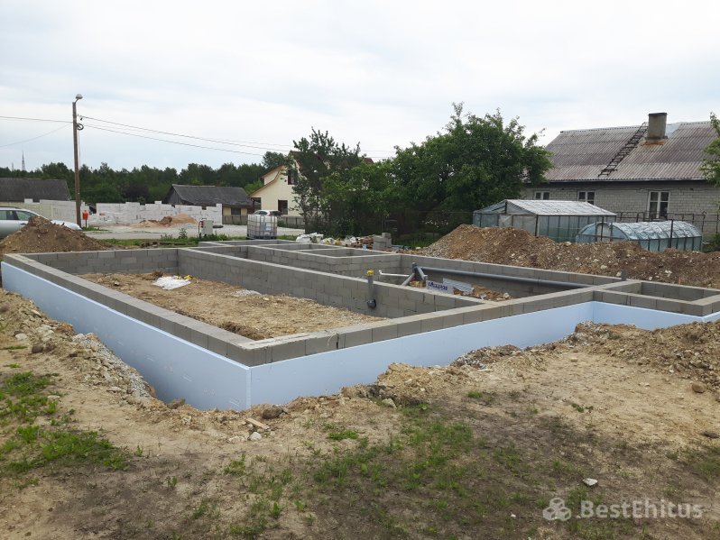 Отопление: Тёплый водяной пол (1 этаж)В ходе работ было выполнено рытьё котлована под фундамент на глубину 1,6 метра, отсыпка и трамбовка щебнем, установка опалубки под фундаментную подушку и её заливка бетоном. Далее поверх подушки происходила кладка стен фундамента Fibo блоком до отметки -14 см и утепление стен фундамента пенопластом.
