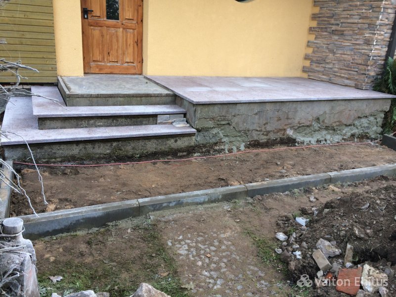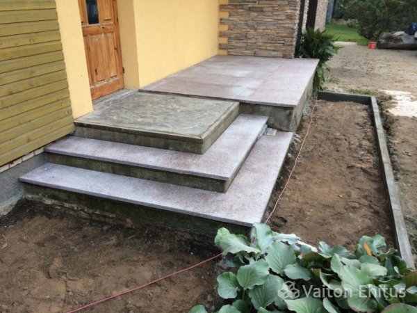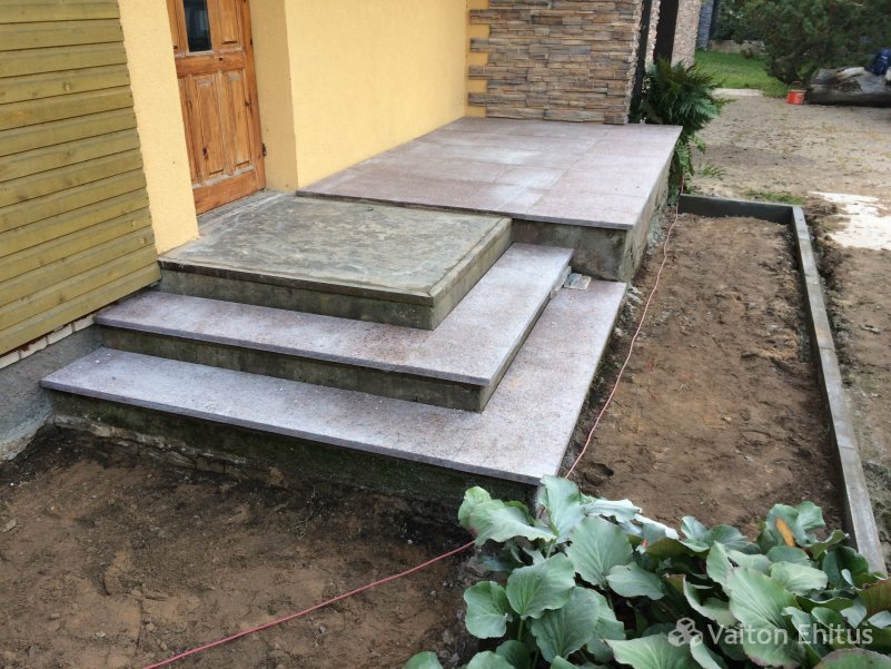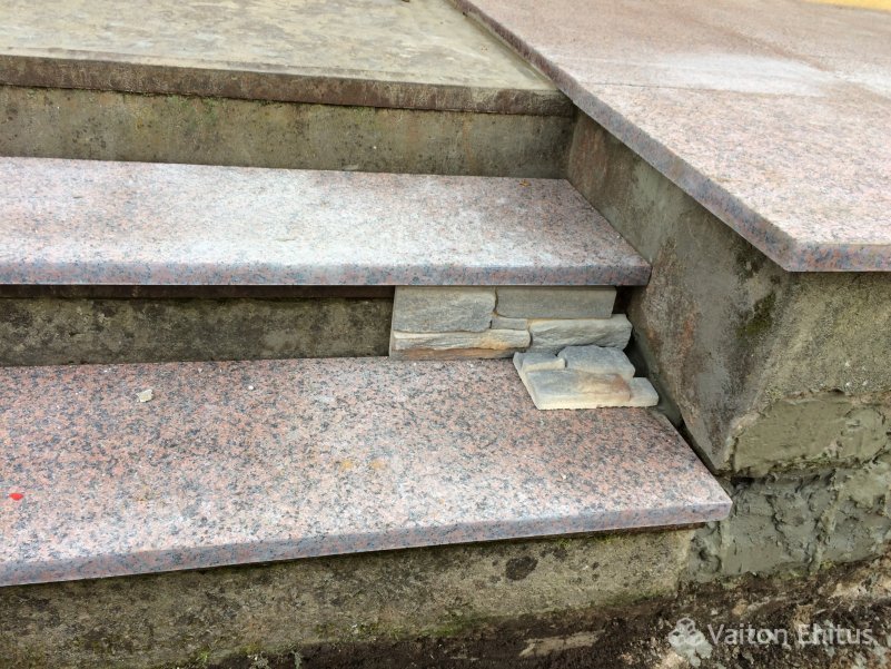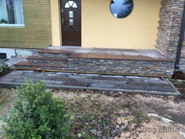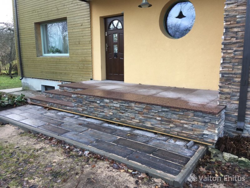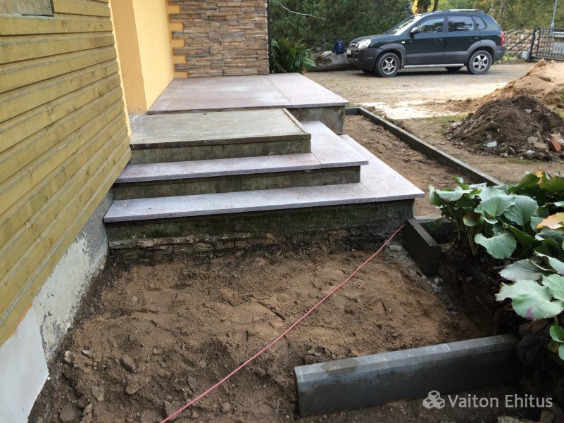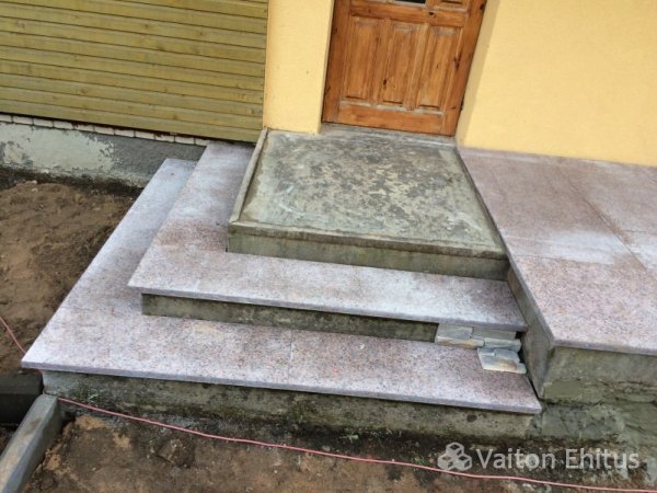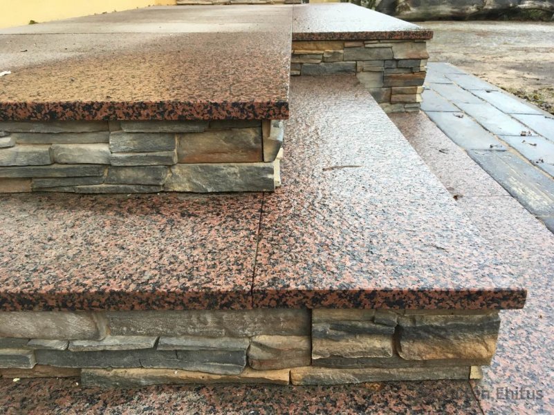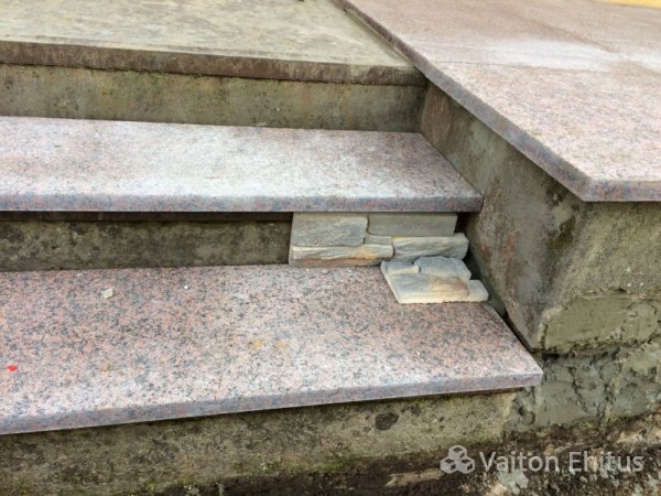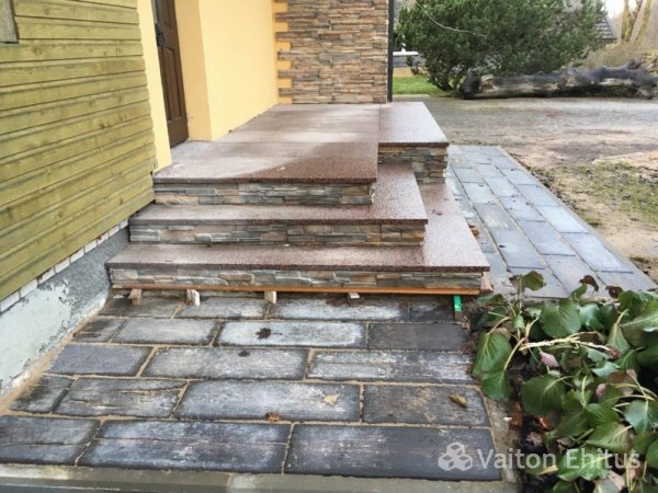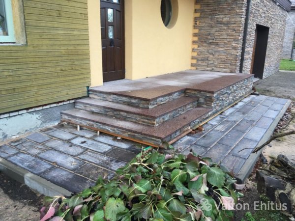 Реставрация крыльца в частном доме в Тойла с помощью гранитного камня и декоративного камня с торцов ступеней.