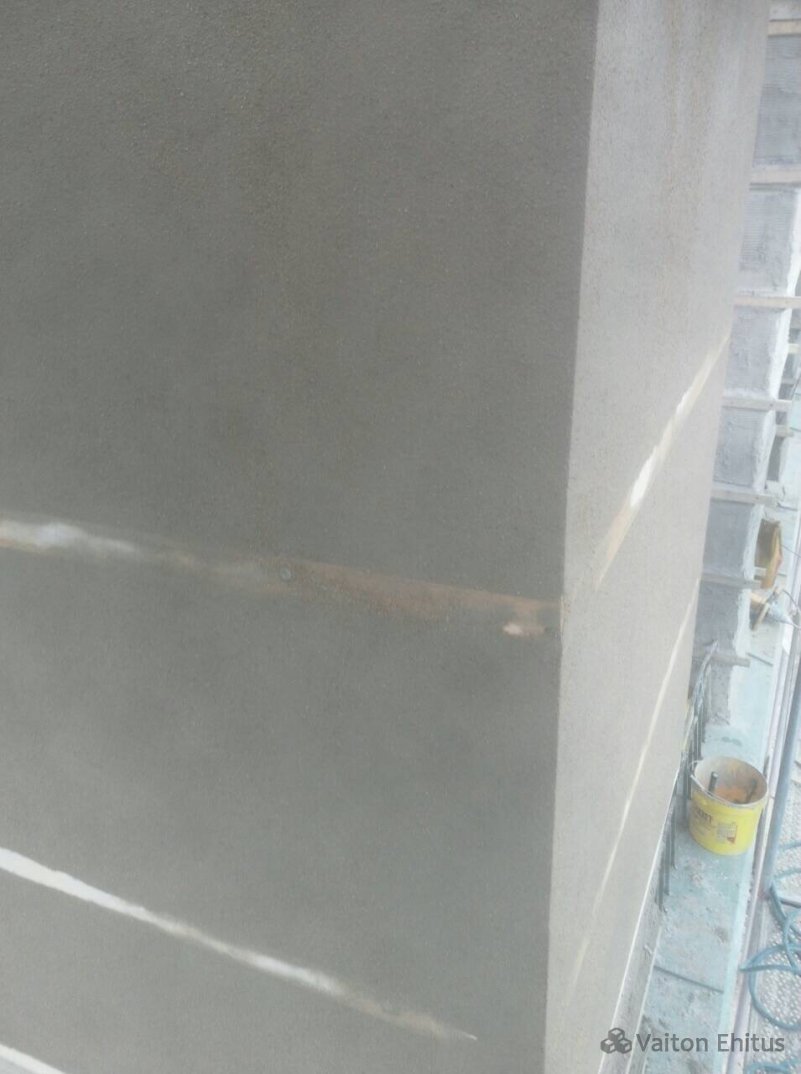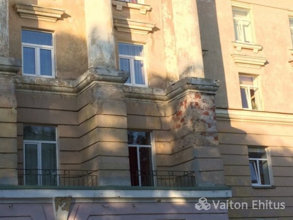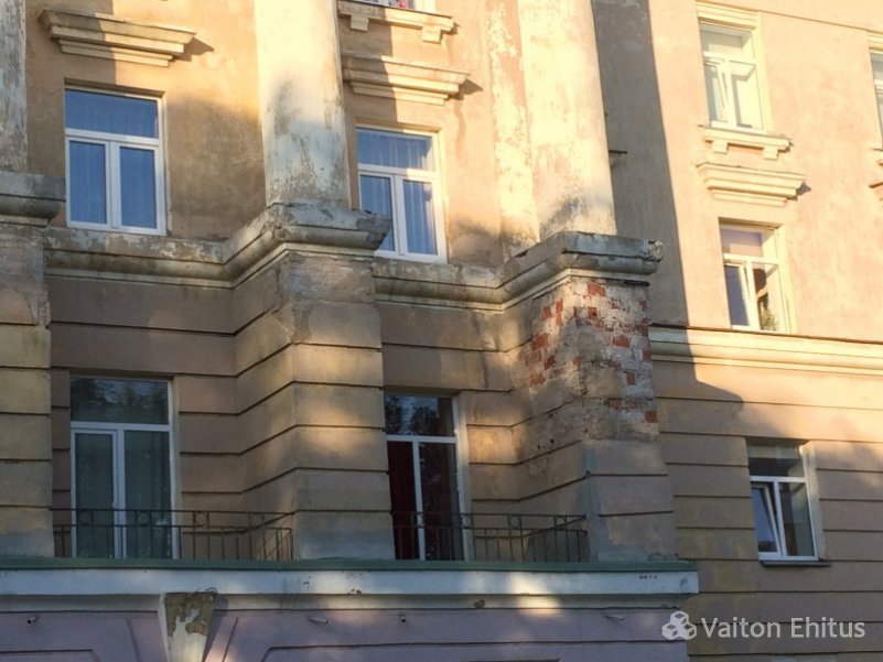 Здание было построено в 1948 году и за эти годы не было проведено никаких работ с фасадом. В ходе реновации была удалена старая штукатурка здания до кирпичной кладки. В результате чего, в некоторых местах кладки обнаружились трещины здания. Одна из трещин оказалась в несущей конструкции кирпичной кладки (фото ниже)
