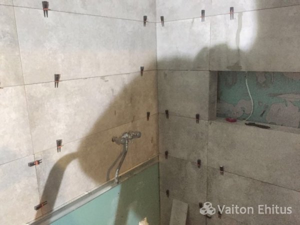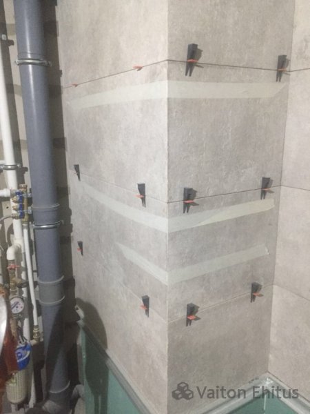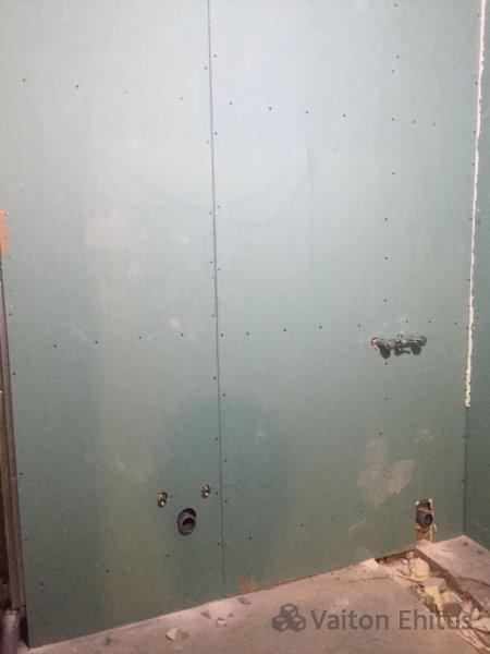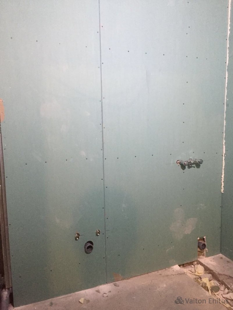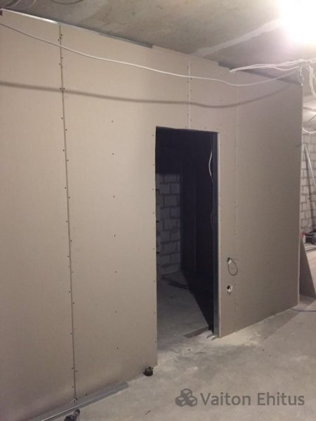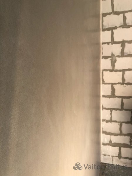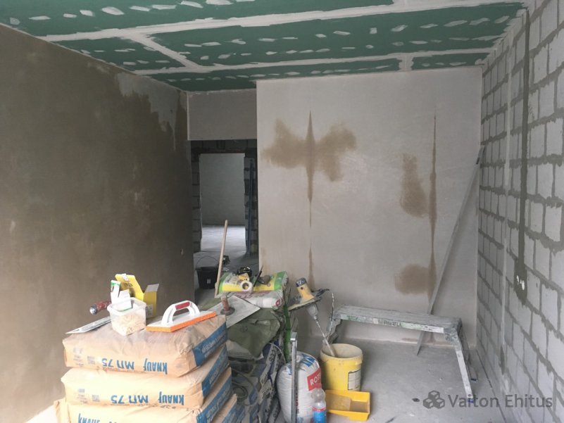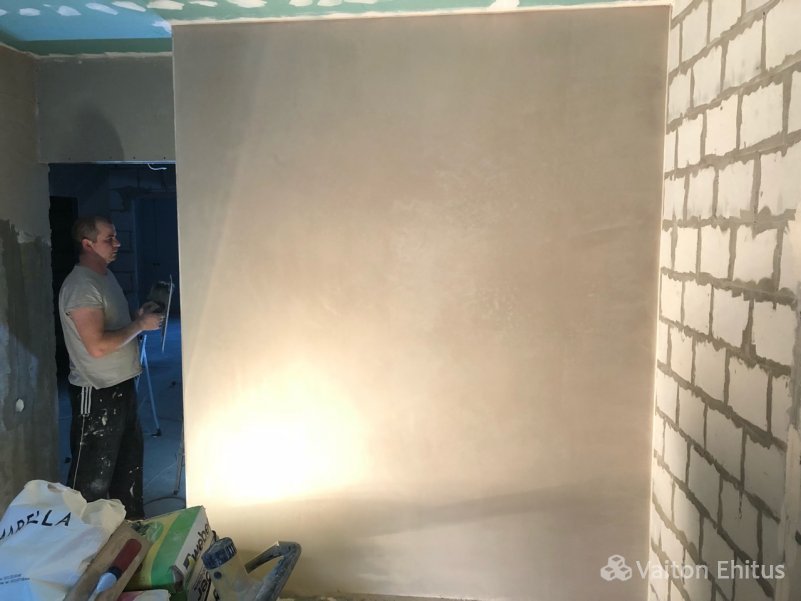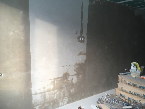 Для штукатурки стен использовался специальный инструмент и штукатурка MP75. После разглаживания, финишный слой каменеет и становится очень твёрдый и блестящий. Как это часто бывает на стройплощадках, финишный слой шпаклёвки (непосредственно перед покраской) обязательно кто нибудь заденет каркасом или шпателем и сделает царапину, которую опять прийдётся шпаклевать. К тому же в ходе эксплуатации стен помещения не редко случается казусы, когда царапают уже покрашенные стены.