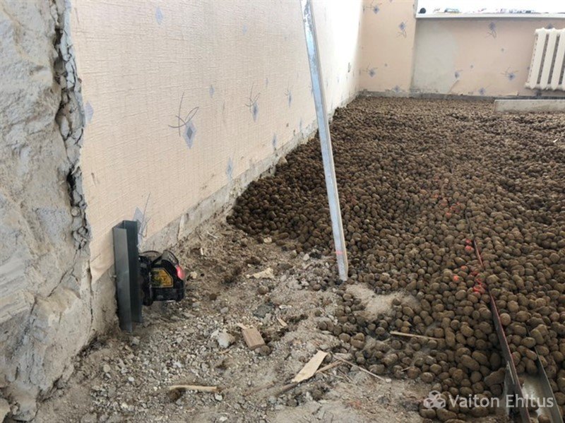 Поверх чистого полового покрытия (обычно в домах это бетонные перекрытия) укладывается и разравнивается керамзит. Предпочтительней укладывать керамзит мелкой фракции, в этом случае плотность увеличивается, а значит увеличивается тепло- и звукоизоляция.