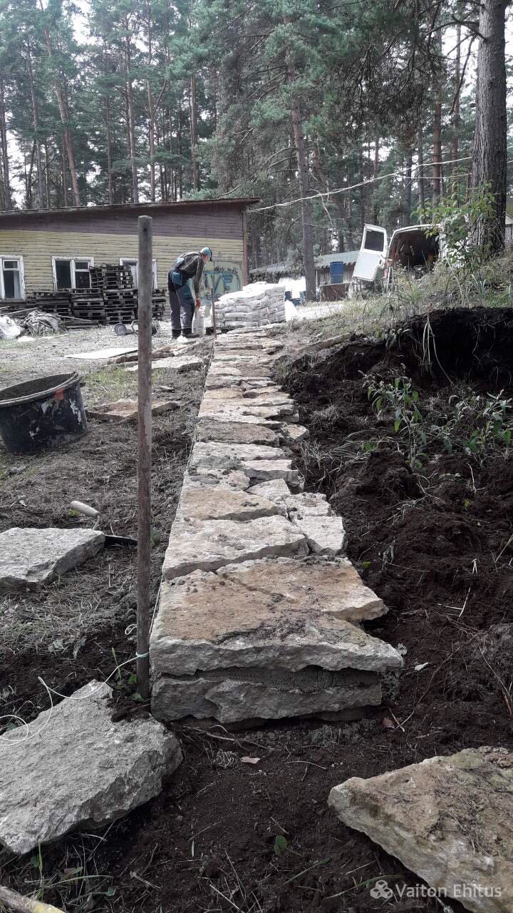 Была произведена укладка природного камня для забора и укладка камня под ворота.